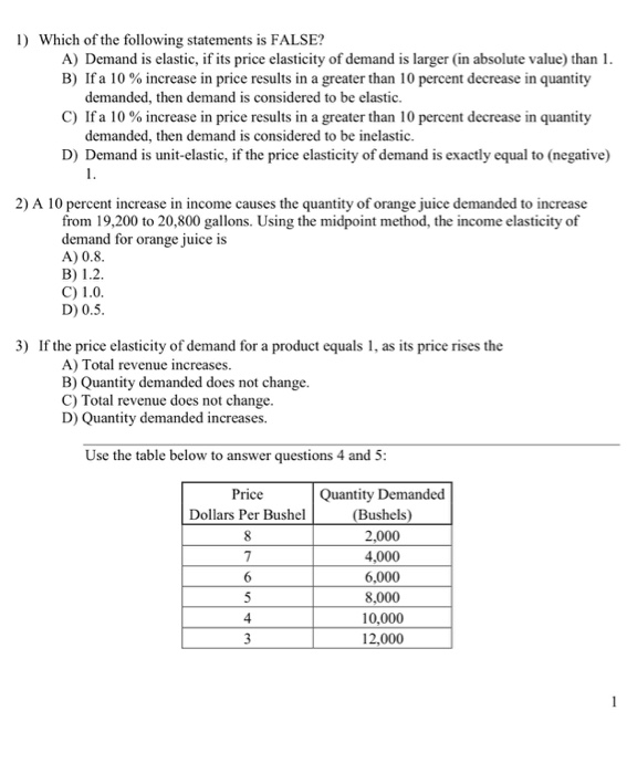 If the demand curve for orange juice is expressed as q 2000 500p where q is quantity in gallons and p is price per gallon measured in dollar then the demand for orange juice has a unitary elasticity when price equals a 0 b 1 c 2 d 4.